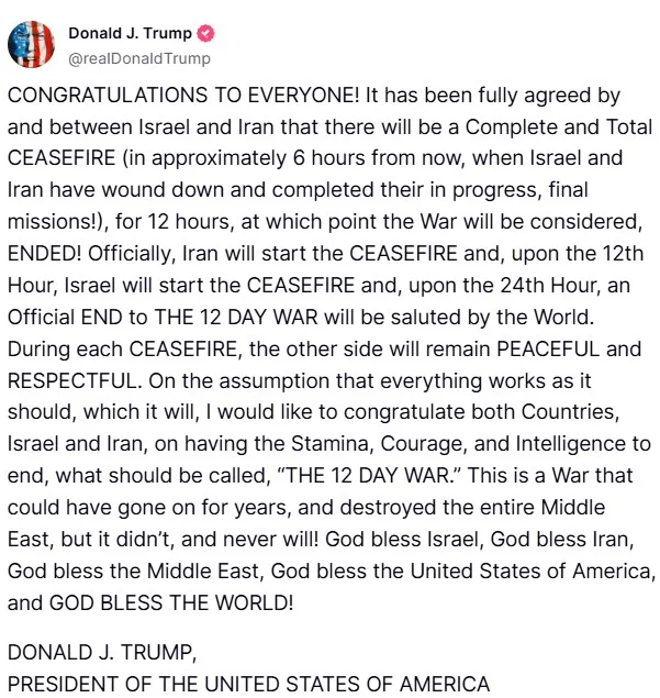 Μέσα από ανάρτησή του στην πλατφόρμα Truth Social, ο Τραμπ ανέφερε χαρακτηριστικά: «Έχει επιτευχθεί πλήρης συμφωνία μεταξύ Ισραήλ και Ιράν για απόλυτη εκεχειρία… για 12 ώρες. Μετά το πέρας αυτών των ωρών, ο πόλεμος θα θεωρείται ΛΗΞΑΣ!».