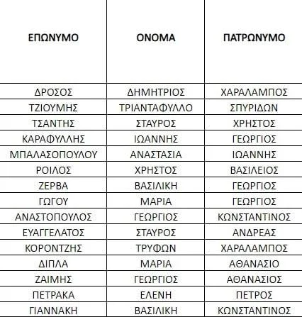 Δείτε τον πίνακα με όλα τα ονόματα: