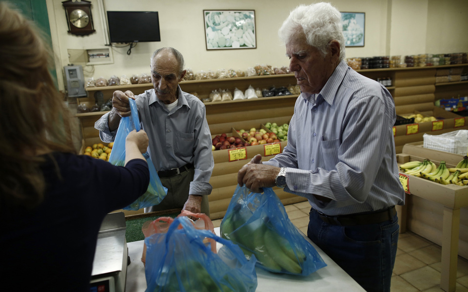 Ο Γιώργος Μιχελής (Δ), 84 χρονών και ο φίλος του Γιάννης Κόττορος, 86 χρονών, ψωνίζουν σε μανάβικο στο νησί της Σάμου.