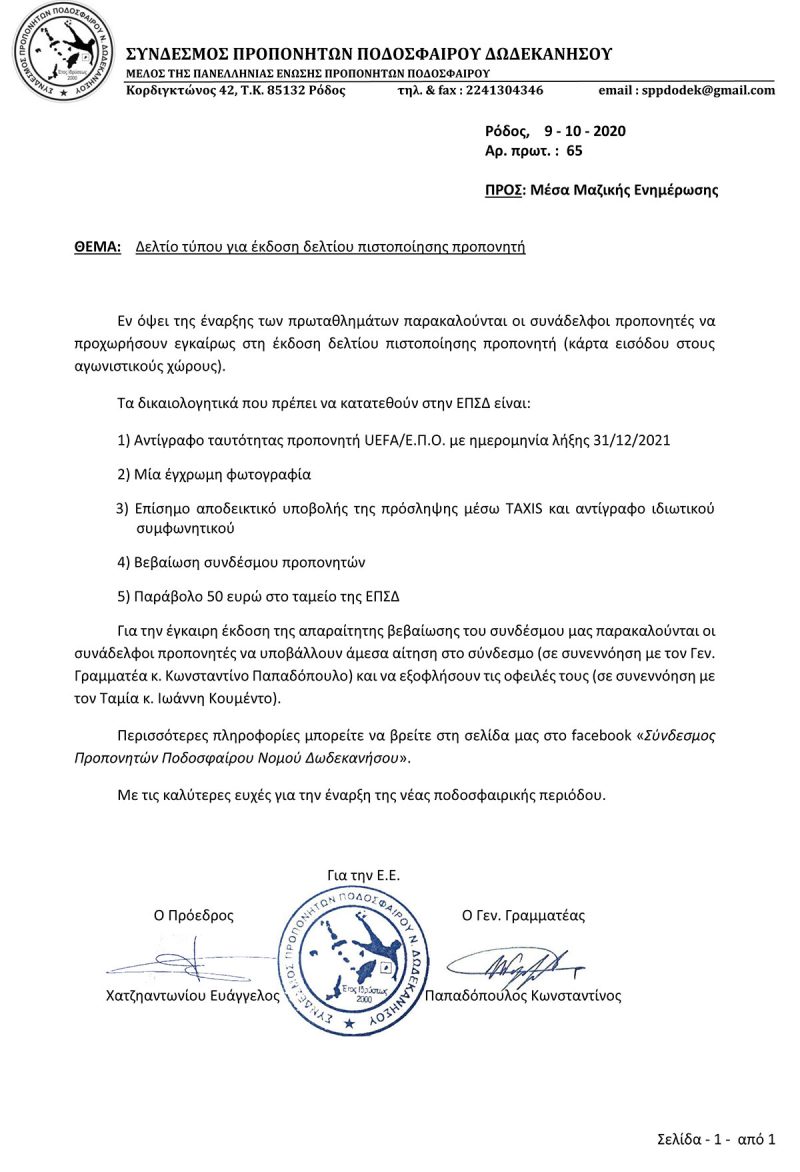 Περισσότερες πληροφορίες μπορείτε να βρείτε στη σελίδα μας στο facebook «Σύνδεσμος Προπονητών Ποδοσφαίρου Νομού Δωδεκανήσου».