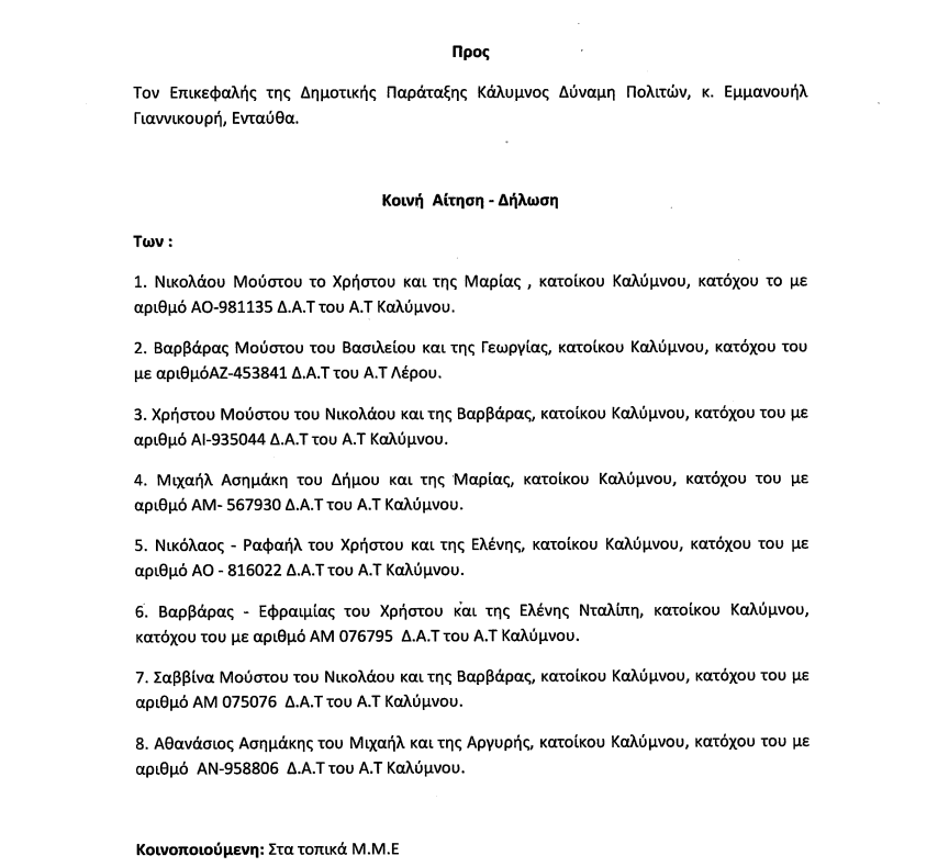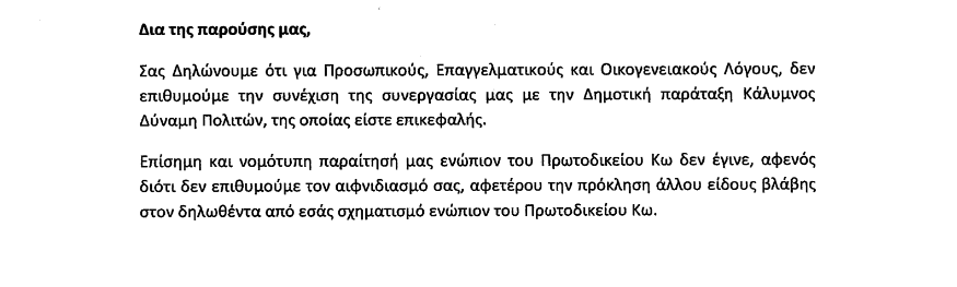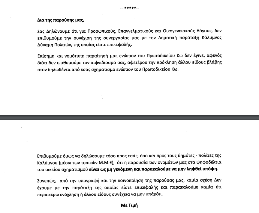 Δήλωση παραίτησης από 6 δημοτικούς συμβούλους που συμμετείχαν στο Συνδυασμό “ΚΑΛΥΜΝΟΣ ΔΥΝΑΜΗ ΠΟΛΙΤΩΝ” με επικεφαλής τον υποψήφιο Δήμαρχο Εμμανουήλ Γιαννικουρή και είχαν ανακηρυχθεί κανονικά από το Πρωτοδικείο Κω.
