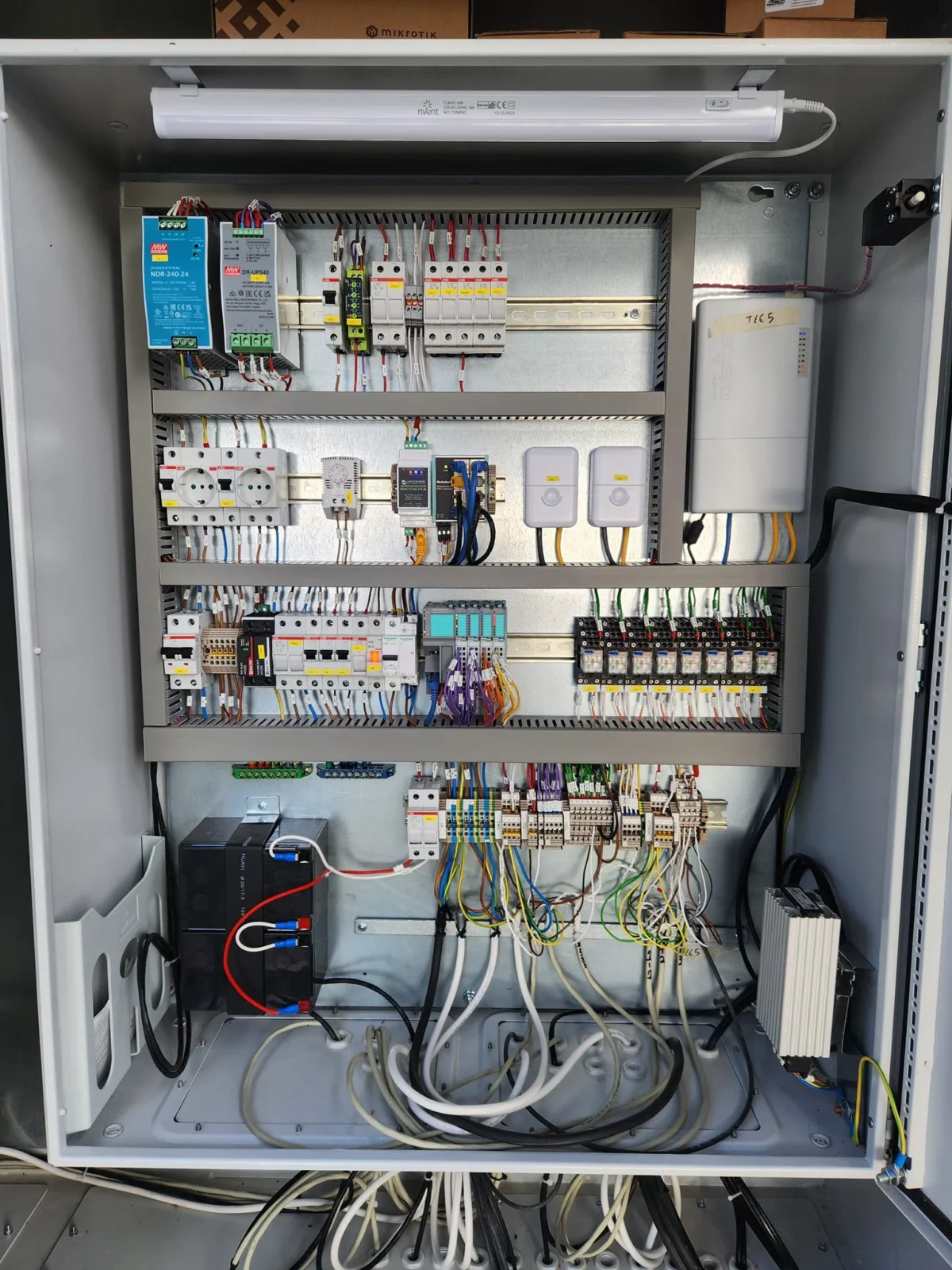 -Σε κάθε γεώτρηση, αντλιοστάσιο και δεξαμενή έχει τοποθετηθεί πίνακας αυτοματισμού που περιλαμβάνει σύστημα προγραμματιζόμενου ελεγκτή για την συλλογή των μετρήσεων από διάφορα όργανα μέτρησης ποσοτικών παραμέτρων του δικτύου νερού (στάθμη, παροχή και πίεση) καθώς και σύστημα ανάλυσης των ποιοτικών χαρακτηριστικών του νερού (υπολειμματικό χλώριο).
