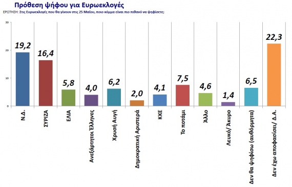 Στην πρόθεση ψήφου για τις ευρωεκλογές στην περιφέρεια Νοτίου Αιγαίου η ΝΔ προηγείται με 19,2%, ακολουθεί ο ΣΥΡΙΖΑ με 16,4% και τρίτο έρχεται Το Ποτάμι με 7,5%. Στην τέταρτη θέση βρίσκεται η Χρυσή Αυγή με 6,2 %, πεμπτη η Ελιά με 5,8%, το ΚΚΕ ακολουθεί με 4,1% , οι ΑΝΕΛ με 4% και τελευταία η ΔΗΜΑΡ με 2%.
