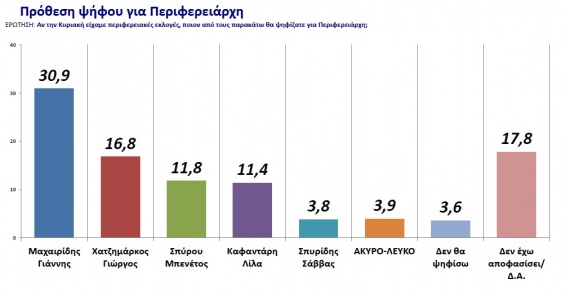 Ο Γιάννης Μαχαιρίδης που υποστηρίζεται από το ΠΑΣΟΚ συγκεντρώνει το 30,9% στην πρόθεση ψήφου των πολιτών, με δεύτερο τον Γιώργο Χατζημάρκο, «εκλεκτό» της ΝΔ που καταγράφει ποσοστό 16,8%. Τρίτος έρχεται ο Μπενέτος Σπύρου με 11,8% υποστηριζόμενος από ΣΥΡΙΖΑ και ΑΝΕΛ, τέταρτη η Λίλα Καφαντάρη του ΚΚΕ με 11,4% και πέμπτος ο υποψήφιος της Χρυσής Αυγής Σάββας Σπυρίδης με 3,8%.