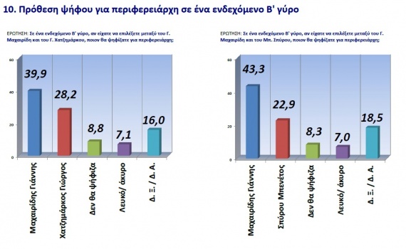 Σε ενδεχόμενο δεύτερο γύρο, ο νυν περιφερειάρχης Γιάννης Μαχαιρίδης (ΠΑΣΟΚ) επικρατεί και στα δύο πιθανότερα σενάρια, στο πρώτο με διαφορά 11,7% από τον Γιώργο Χατζημάρκο της ΝΔ και στο δεύτερο με 20,4% από τον Μπενέτο Σπύρου που υποστηρίζεται από ΣΥΡΙΖΑ και ΑΝΕΛ.