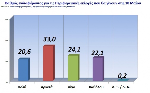 Σημαντικό είναι το ενδιαφέρον που εκδηλώνουν για τις αυτοδιοικητικές εκλογές οι πολίτες της περιφέρειας Νοτίου Αιγαίου καθώς αθροιστικά αυτοί που ενδιαφέρονται πολύ – αρκετά ανέρχονται στο 53,6% σε αντίθεση με αυτούς που δηλώνουν ότι ενδιαφέρονται λίγο έως καθόλου σε ποσοστό 46,2%.
