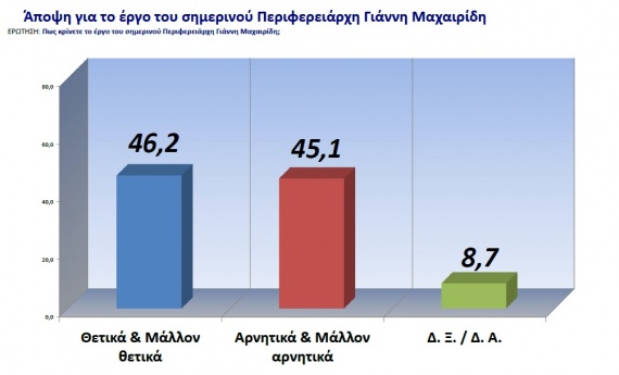 Διχασμένοι εμφανίζονται οι πολίτες σχετικά με το πώς κρίνουν το έργο του σημερινού περιφερειάρχη Γιάννη Μαχαιρίδη, καθώς θετικά και μάλλον θετικά κρίνει το 46,2 των ψηφοφόρων, ενώ αρνητικά και μάλλον αρνητικά κρίνει το 45,1%.