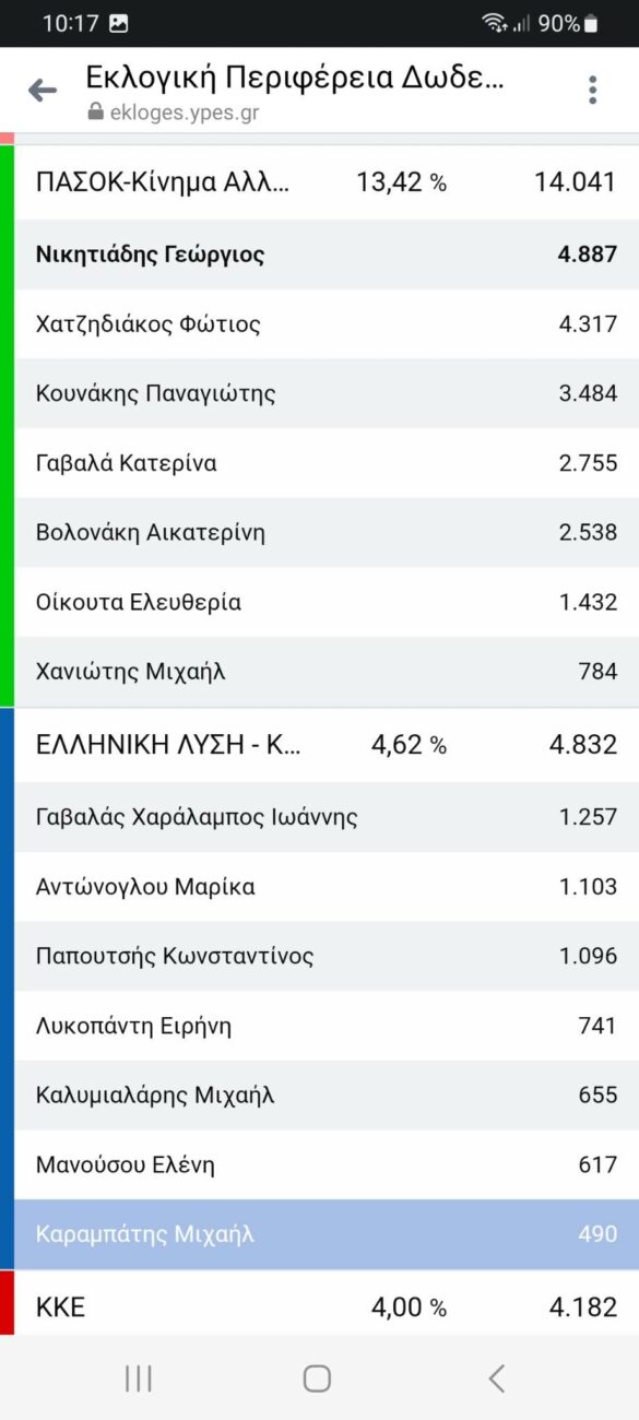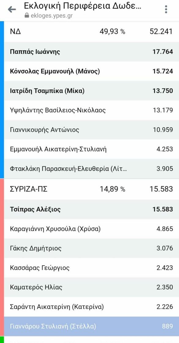 Ο Γιάννης Παππάς αναδείχθηκε πρώτος Βουλευτής στα Δωδεκάνησα, απογειώνοντας τη δύναμη και τα ποσοστά του από το 2019. me 17.764 ψήφους, ακολουθεί στη δεύτερη θέση ο Μάνος Κόνσολας με 15.724 ψήφους και η Μίκα Ιατρίδη με 13.750 ψήφους.
