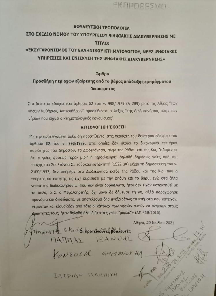 Η εν λόγω τροπολογία, την οποία συνυπογράφουμε όλοι οι συνάδελφοι, βουλευτές Δωδεκανήσου της ΝΔ, ορίζει πως στο δεύτερο εδάφιο του άρθρου 62 του ν. 998/1979 (Ά 289) μετά τις λέξεις “των νήσων Κυθήρων, Αντικυθήρων” προστίθενται οι λέξεις ‘’της Δωδεκανήσου, πλην των νήσων που ισχύει ο κτηματολογικός κανονισμός”.