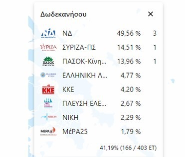 Αρχική » ΟΛΕΣ ΟΙ ΕΙΔΗΣΕΙΣ » ΔΩΔΕΚΑΝΗΣΑ » Η κατανομή εδρών στα Δωδεκάνησα με τα μέχρι τώρα αποτελέσματα (3 ΝΔ-1 ΣΥΡΙΖΑ-1 ΠΑΣΟΚ)