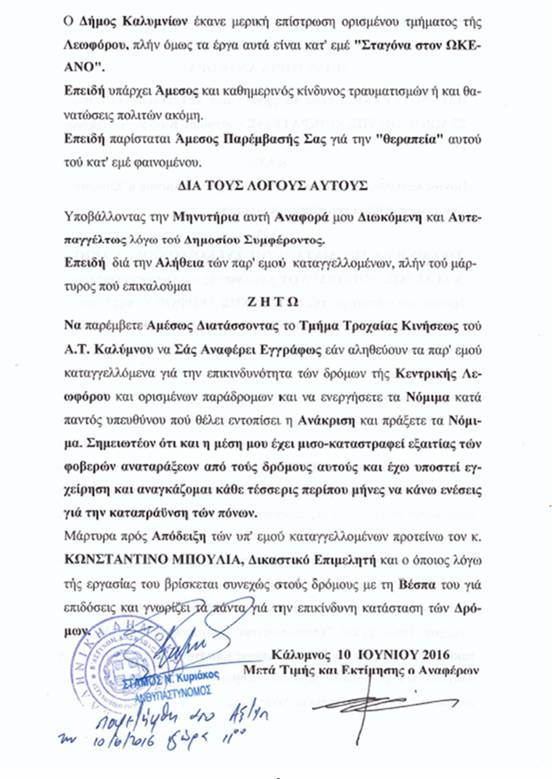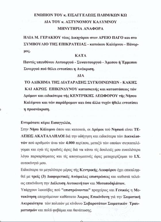 Μηνυτήρια αναφορά κατά παντός υπευθύνου για την κακή κατάσταση του οδικού δικτύου στην Κάλυμνο, κατέθεσε σήμερα Παρασκευή 10 Ιουνίου 2016 ο τ. Δικηγόρος Ηλίας Γερακιός.