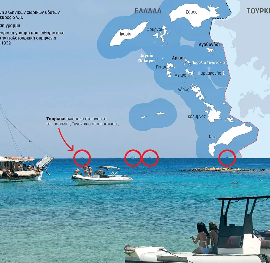 Αλλά το κρυφτό αυτό του Λιμενικού με τους Τούρκους ψαράδες καλά κρατεί: η περιοχή μεταξύ Σάμου, Αγαθονησίου και Λειψών, όπου οι τουρκικές ανεμότρατες εμφανίστηκαν και πάλι, ακόμη και στο ένα μίλι από τους Αρκιούς προς έκπληξη όσον Ελλήνων παραθερίζουν την περίοδο αυτή στα νησιά αυτά, δεν είναι η μόνη στην οποία έχουν εισβάλει ατύπως οι Τούρκοι ψαράδες.