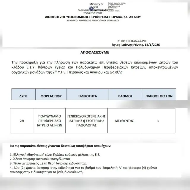 Η προκήρυξη-πρόσκληση υποβολής αίτησης πρόσληψης ξεκινά σήμερα, Παρασκευή 23 του μηνός, και θα παραμείνει ανοιχτή για δεκαπέντε (15) ημέρες, δίνοντας τη δυνατότητα σε κάθε ενδιαφερόμενο ειδικευμένο ιατρό να διεκδικήσει τη θέση.