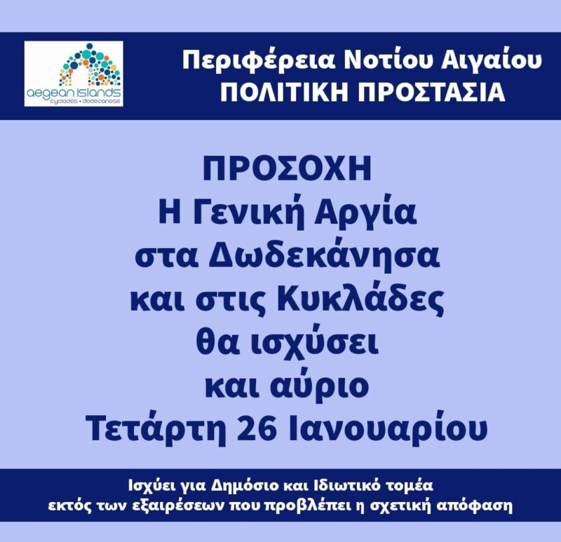 Παράταση αργίας και για αύριο, Τετάρτη και για τα Δωδεκάνησα γνωστοποίησε η Πολιτική Προστασία.