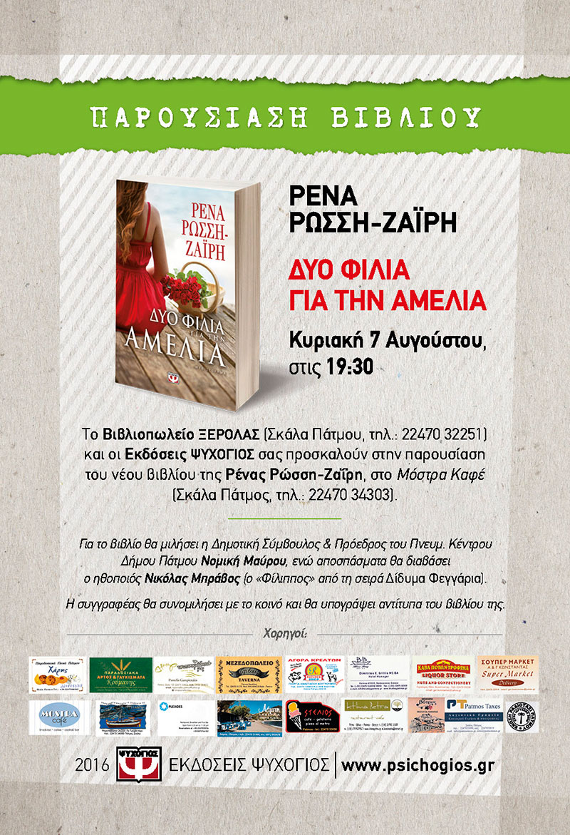 Το Βιβλιοπωλείο ΞΕΡΟΛΑΣ (Σκάλα Πάτμου, τηλ.: 22470 32251) και οι Εκδόσεις ΨΥΧΟΓΙΟΣ σας προσκαλούν στην παρουσίαση του νέου βιβλίου της Ρένας Ρώσση-Ζαΐρη, την Κυριακή 07/08/2016 και ώρα 19:30 στο Μόστρα Καφέ (Σκάλα Πάτμος, τηλ.: 22470 34303).