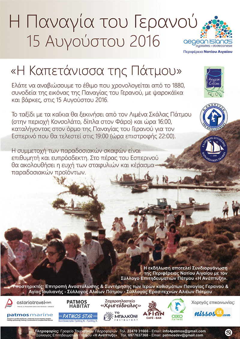 Στις 15 Αυγούστου 2016 και ώρα 16:00 θα ξεκινήσουμε την συνοδεία της εικόνας από την περιοχή « Κονσολάτο» του Λιμένα Σκάλας Πάτμου με τα καΐκια μας. Η Λιμενική Αρχή Πάτμου θα βρίσκεται δίπλα μας συνοδεύοντας με τον δικό της τρόπο τα σκάφη.