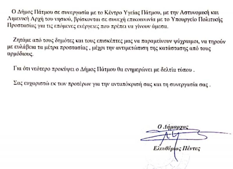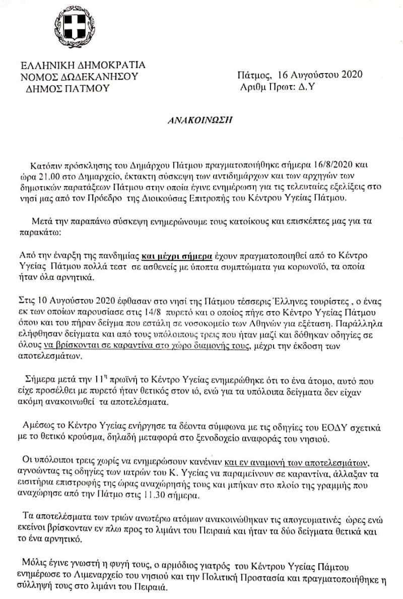 Αρχική » ΟΛΕΣ ΟΙ ΕΙΔΗΣΕΙΣ » ΔΩΔΕΚΑΝΗΣΑ » ΠΑΤΜΟΣ » Ανακοίνωση του Δήμου Πάτμου σχετικά με τα κρούσματα κορωνοϊού στο νησί