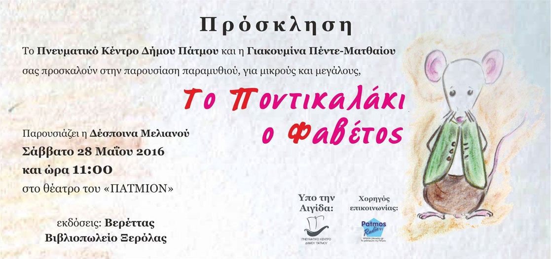 ΠΡΟΣΚΛΗΣΗ: Το Πνευματικό Κέντρο Δήμου Πάτμου και η Γιακουμίνα Πέντε – Ματθαίου σας προσκαλούν στην παρουσίαση παραμυθιού, για μικρούς και μεγάλους, “Το Ποντικαλάκι ο Φαβέτος”.