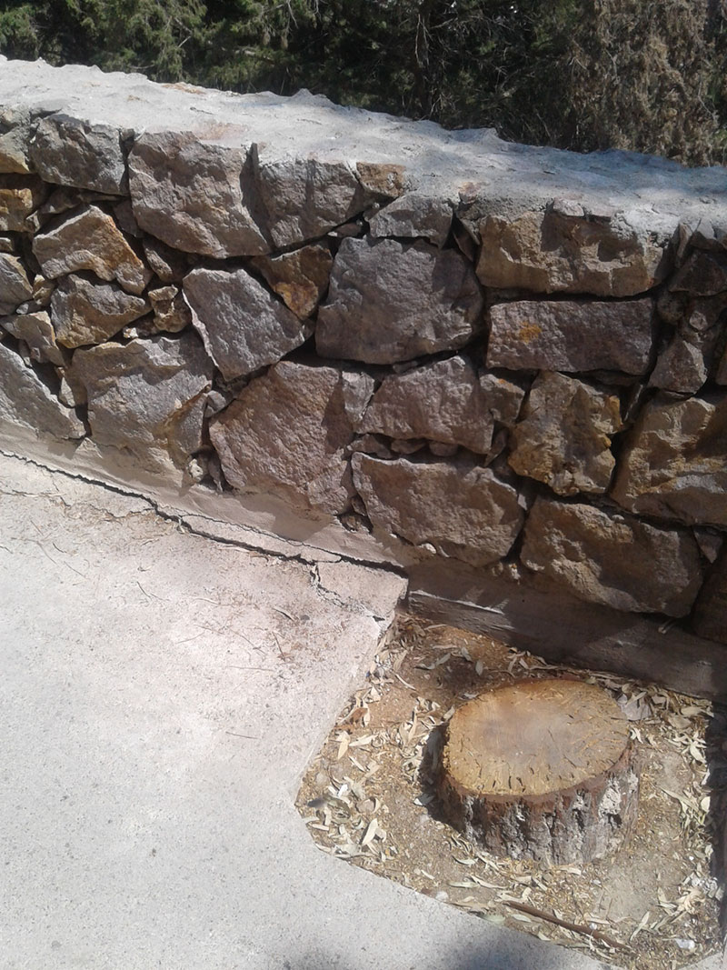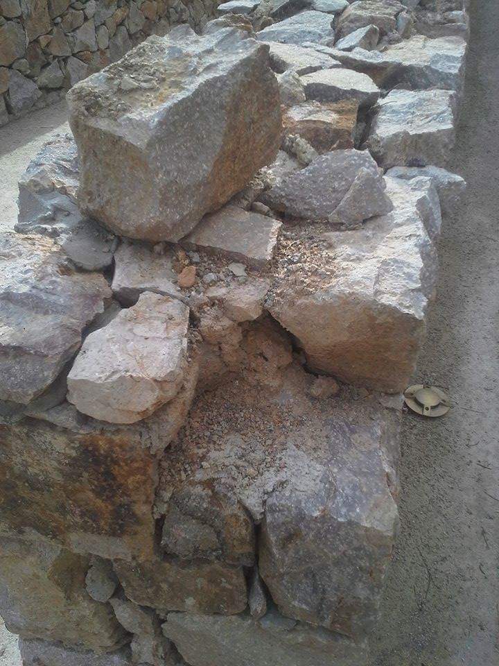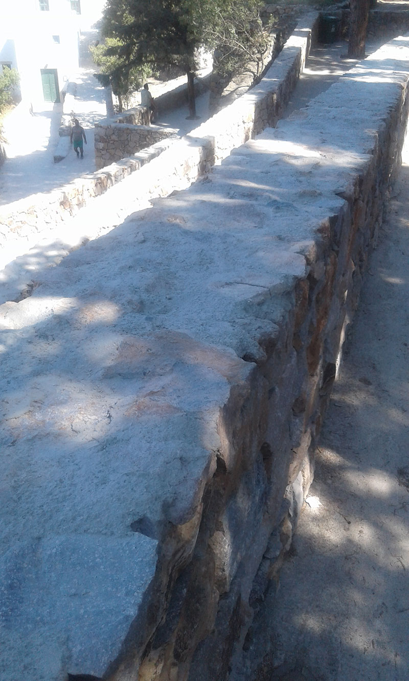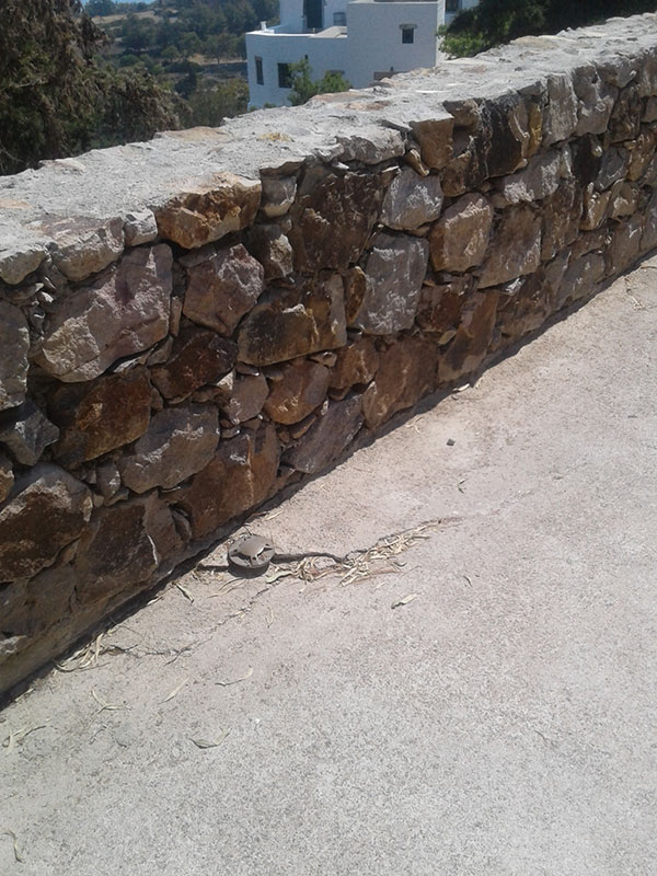 Γ)Οι πέτρες από τους τοίχους αποκολλούνται αρκετά εύκολα διότι δεν τοποθετήθηκαν σωστά. Είναι επίσης παράλογο σε ύψος από το δάπεδο 70 εκατοστών να έχεις τελείωμα τοίχου που θυμίζει μαχαίρι και όχι πελεκημένη πέτρα. Εκ των υστέρων έγινε τελείωμα στηθαίου που κάπως «έδεσε» τις πέτρες μεταξύ τους.