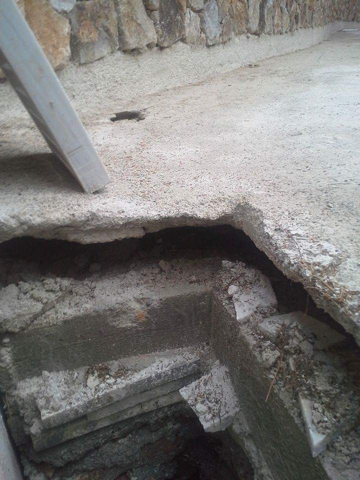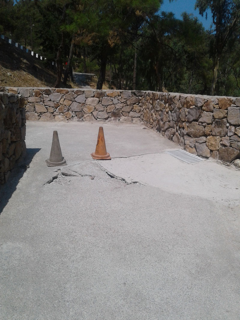Α) Το δάπεδο έχει εμφανίσει σε πολλά σημεία καθίζηση με αποτέλεσμα την δημιουργία οπών διάφορων μεγεθών. Έχουν ήδη γίνει επιδιορθώσεις με όμοια ή ακόμα και με διαφορετικά υλικά από ειδικούς και μη ειδικούς τεχνίτες.