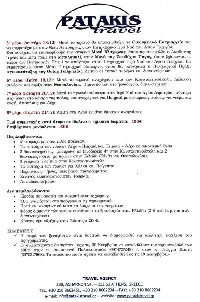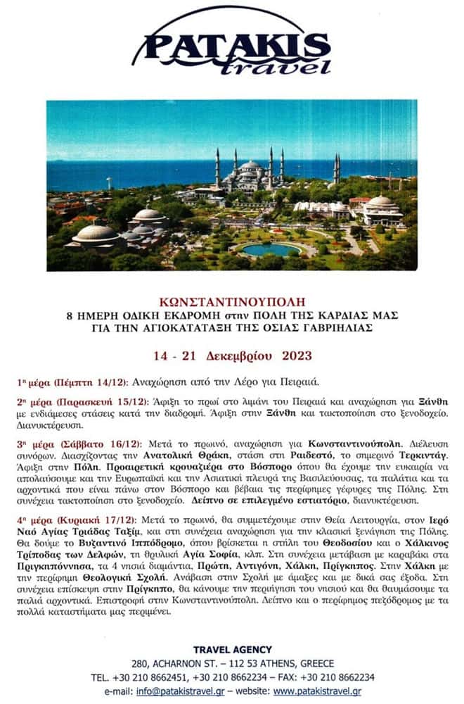Η Ιερά Μητρόπολις Λέρου, Καλύμνου και Αστυπαλαίας διοργανώνει 8ήμερη εκδρομή στην Κωνσταντινούπολη, επ’ ευκαιρία της υπογραφής της Πατριαρχικής Πράξης Αγιοκατάταξης της Οσίας Γαβριηλίας (Παπαγιάννη), που θα λάβη χώρα την Δευτέρα 18 Δεκεμβρίου 2023, στον Πατριαρχικό Ι. Ναό του Αγίου Γεωργίου.