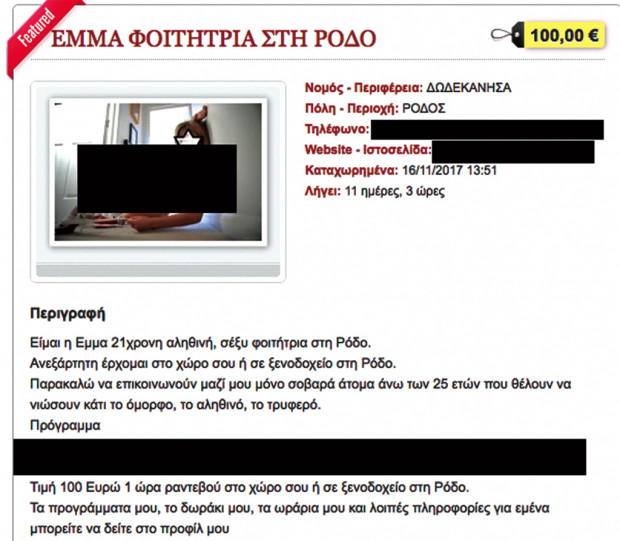 «Είμαι η Εμμα 21χρονη αληθινή, σέξυ φοιτήτρια στη Ρόδο. Ανεξάρτητη έρχομαι στο χώρο σου ή σε ξενοδοχείο στη Ρόδο. Παρακαλώ να επικοινωνούν μαζί μου μόνο σοβαρά άτομα άνω των 25 ετών που θέλουν να νιώσουν κάτι το όμορφο, το αληθινό, το τρυφερό και να είναι αποφασισμένοι ότι θέλουν να κάνουν ραντεβού!».