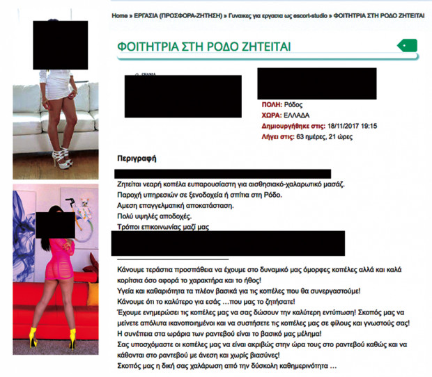 Δεν είναι μάλιστα η πρώτη φορά που με τέτοιο απροκάλυπτο τρόπο δημοσιεύεται στο διαδίκτυο αγγελία για παροχή ερωτικών υπηρεσιών από φοιτήτρια στη Ρόδο.