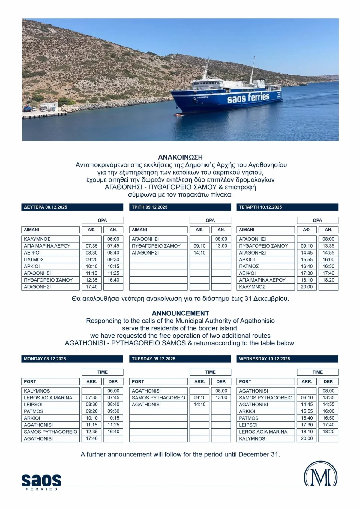 Ανταποκρινόμενη στο αίτημα της Δημοτικής Αρχής Αγαθονησίου και με στόχο την καλύτερη εξυπηρέτηση των κατοίκων του ακριτικού νησιού, η Saos Ferries ανακοίνωσε την παροχή δύο επιπλέον δωρεάν δρομολογίων στη γραμμή Αγαθονήσι – Πυθαγόρειο Σάμου – Αγαθονήσι.