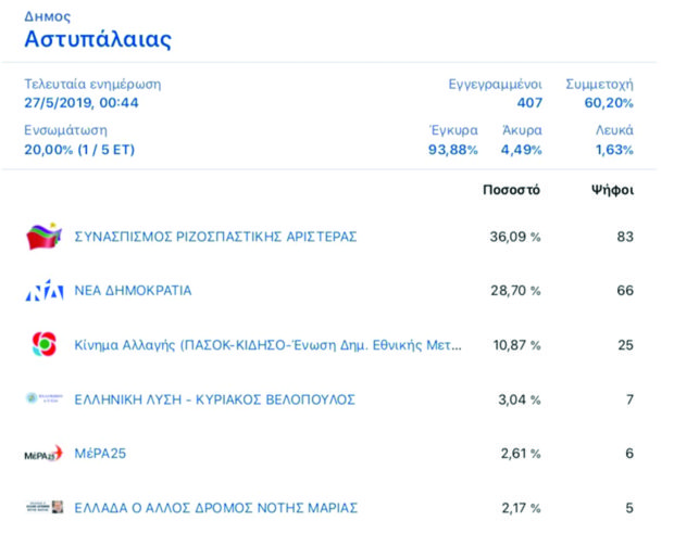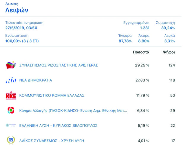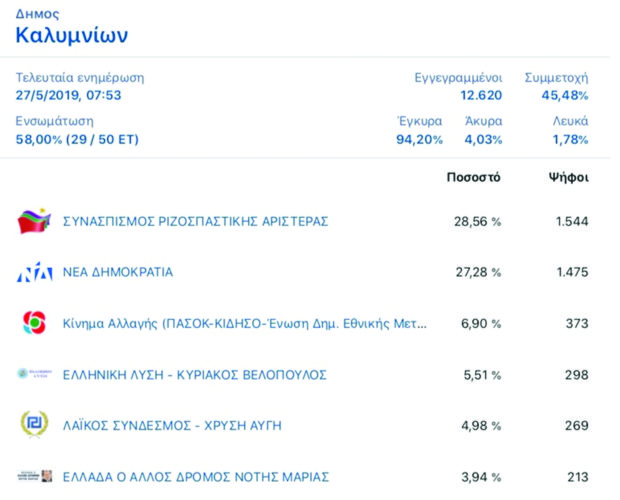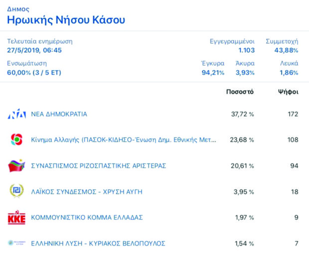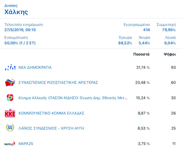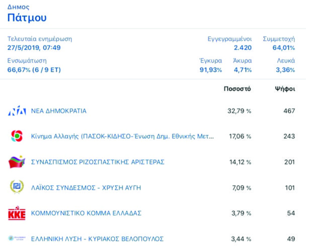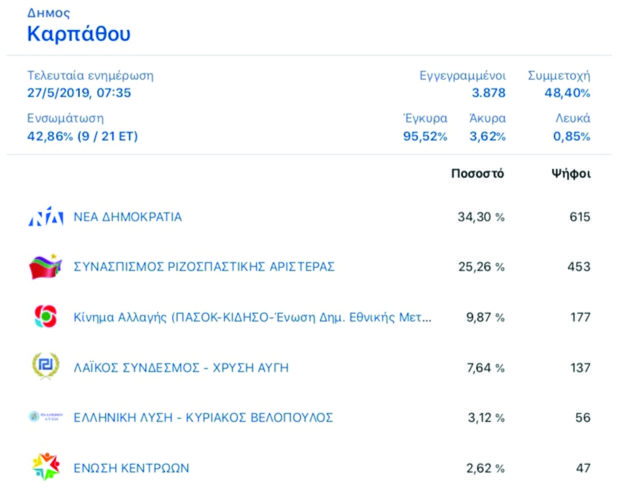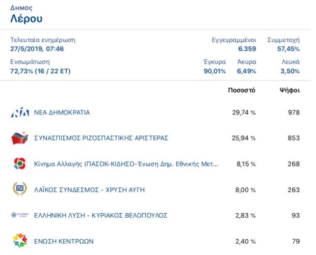 Πιο συγκεκριμένα σύμφωνα με τα στοιχεία που ανήρτησε μέχρι την 17.00 ώρα της Δευτέρας το Υπουργείο Εσωτερικών τα βασικά κόμματα έλαβαν στα Δωδεκάνησα: