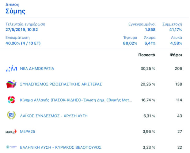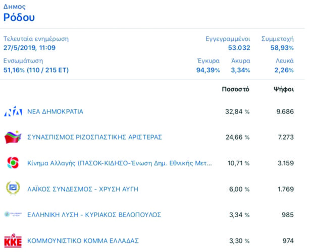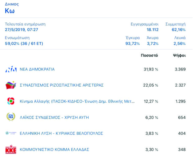 H Nέα Δημοκρατία προηγείται με ποσοστό 31,62% έναντι του ΣΥΡΙΖΑ, που συγκέντρωσε το 24,39%, στις Ευρωεκλογές στα Δωδεκάνησα με καταμετρημένο το 54,59% των εκλογικών τμημάτων (226 από τα 414).