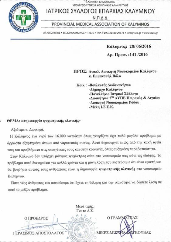 Με επιστολή του που φέρει σημερινή ημερομηνία 28 Ιουνίου 2016 και απευθύνει στον Αναπληρωτή Διοικητή Νοσοκομείου Καλύμνου Εμμανουήλ Βόλο, ο Ιατρικός Σύλλογος Επαρχίας Καλύμνου, ζητά τηδημιουργία ψυχιατρικής κλινικής στο Νοσοκομείο Καλύμνου.