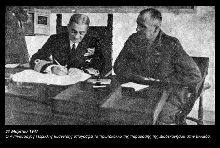 31 Μαρτίου 1947: Ο Βρετανός διοικητής των συμμαχικών Δυνάμεων Κατοχής Δωδεκανήσου ταξίαρχος Α.Σ. Πάρκερ, παραδίδει τη Στρατιωτική Βρετανική Διοίκηση στον αντιναύαρχο Περικλή Ιωαννίδη. Αρχίζει η μεταβατική περίοδος της Ελληνικής Στρατιωτικής Διοίκησης Δωδεκανήσου.