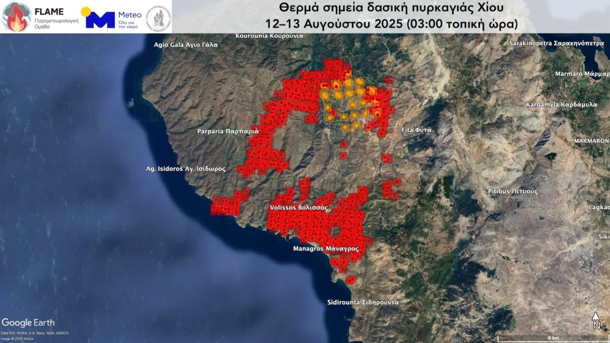 Τα θερμά σημεία ανίχνευσε το όργανο VIIRS (Visible Infrared Imaging Radiometer Suite) των δορυφόρων πολικής τροχιάς SUOMI, NOAA-20 και NOAA-21 στις 03:00 τοπική ώρα Ελλάδας της 13ης Αυγούστου 2025.