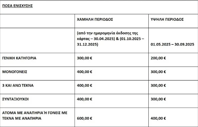 Συγκεκριμένα τα ποσά ενίσχυσης για την Χαμηλή Περίοδο (από την ημερομηνία έκδοσης της κάρτας – 30.04.2025 & 01.10.2025 – 31.12.2025) και την Υψηλή Περίοδο (01.05.2025 – 30.09.2025) διαμορφώνονται ως εξής: