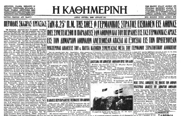 «Την 8.25’ π.μ. της χθες ο γερμανικός στρατός εισήλθεν εις Αθήνας», έγραψε στο πρωτοσέλιδο της 28ης Απριλίου 1941 η «Καθημερινή», ανακοινώνοντας στους αναγνώστες της ότι η ελληνική πρωτεύουσα βρισκόταν πλέον υπό γερμανική κατοχή.