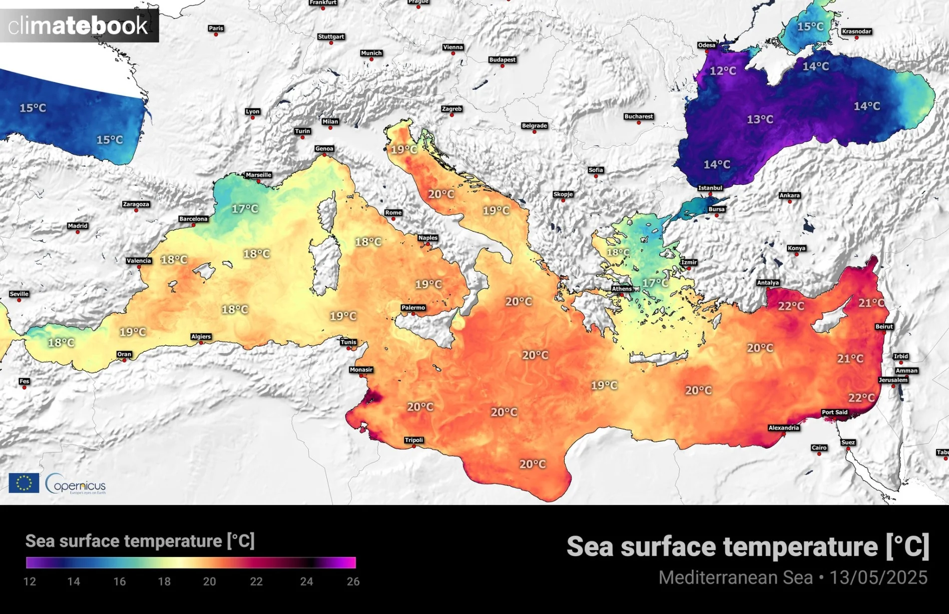 Σύμφωνα με το Climatebook, η θερμοκρασία της επιφάνειας της θάλασσας στη Μεσόγειο κυμαίνεται από 18 έως 22 βαθμούς Κελσίου.