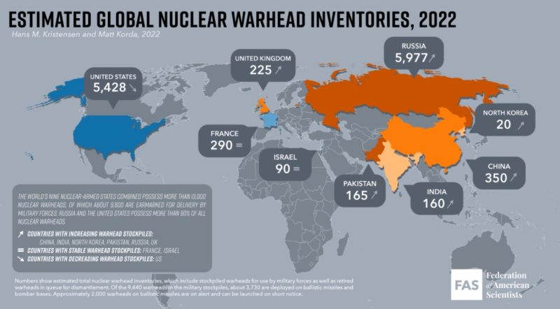 Παρά την πρόοδο στη μείωση των πυρηνικών όπλων ειδικότερα στον μεταψυχροπολεμικό κόσμο, το απόθεμα πυρηνικών κεφαλών παραμένει παγκοσμίως σε πολύ υψηλό επίπεδο με εννέα χώρες (επιβεβαιωμένα) να διαθέτουν περίπου 12.700 κεφαλές στις αρχές του 2022.