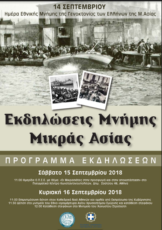 Την Κυριακή 16 Σεπτεμβρίου 2018 και ώρα 11 πμ θα τελεσθεί επιμνημόσυνη δέηση στον Ιερό Καθεδρικό Ναό της Αθήνας και ομιλία από τον εκπρόσωπο της κυβέρνησης. Ακολουθεί δέηση στο μνημείο του Εθνο-ιερομάρτυρα Αγίου Χρυσοστόμου Σμύρνης με σύντομη ομιλία και κατάθεση στεφάνου από τον πρόεδρο της ΟΠΣΕ. Στη συνέχεια θα σχηματισθεί πορεία, παρουσία τιμητικού αγήματος και φιλαρμονικής, η οποία θα φτάσει στο Μνημείο του Άγνωστου Στρατιώτη , στην πλατεία Συντάγματος και θα γίνει κατάθεση στεφάνων από εκπροσώπους των Μικρασιατικών Σωματείων.