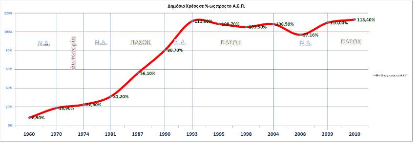 Παρατηρώντας κανείς το διάγραμμα της πορείας του δημόσιου χρέους ως ποσοστού του ΑΕΠ από τη δεκαετία του 1960 μέχρι και σήμερα, βλέπει ξεκάθαρα την εκτίναξή του κατά το διάστημα 1981 έως και 1993. Από το 31,2% το 1981 φτάνει στο 80,7% το 1990 και εκτινάσσεται πάνω από το 111% του ΑΕΠ το 1993. Είναι η πρώτη εποχή του αλόγιστου δανεισμού, της διασπάθισης του δημόσιου χρήματος, των πολιτικών σκανδάλων και της κατάφορης εκμετάλλευσης των κοινοτικών επιδοτήσεων και προγραμμάτων στήριξης στο βωμό μιας ανάπτυξης που βασιζόταν στην κατανάλωση.