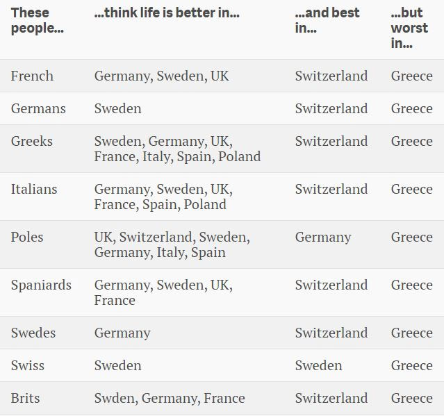 Την εντύπωση πως η Ελλάδα έχει καλύτερες συνθήκες ζωής συγκριτικά με άλλες χώρες μοιράζεται μόνο ένα 1/3 Ελλήνων και Ιταλών ερωτηθέντων, σε αντίθεση με τους συμμετέχοντες στην έρευνα από χώρες της βόρειας Ευρώπης όπως η Γερμανία, η Σουηδία και η Μεγάλη Βρετανία.