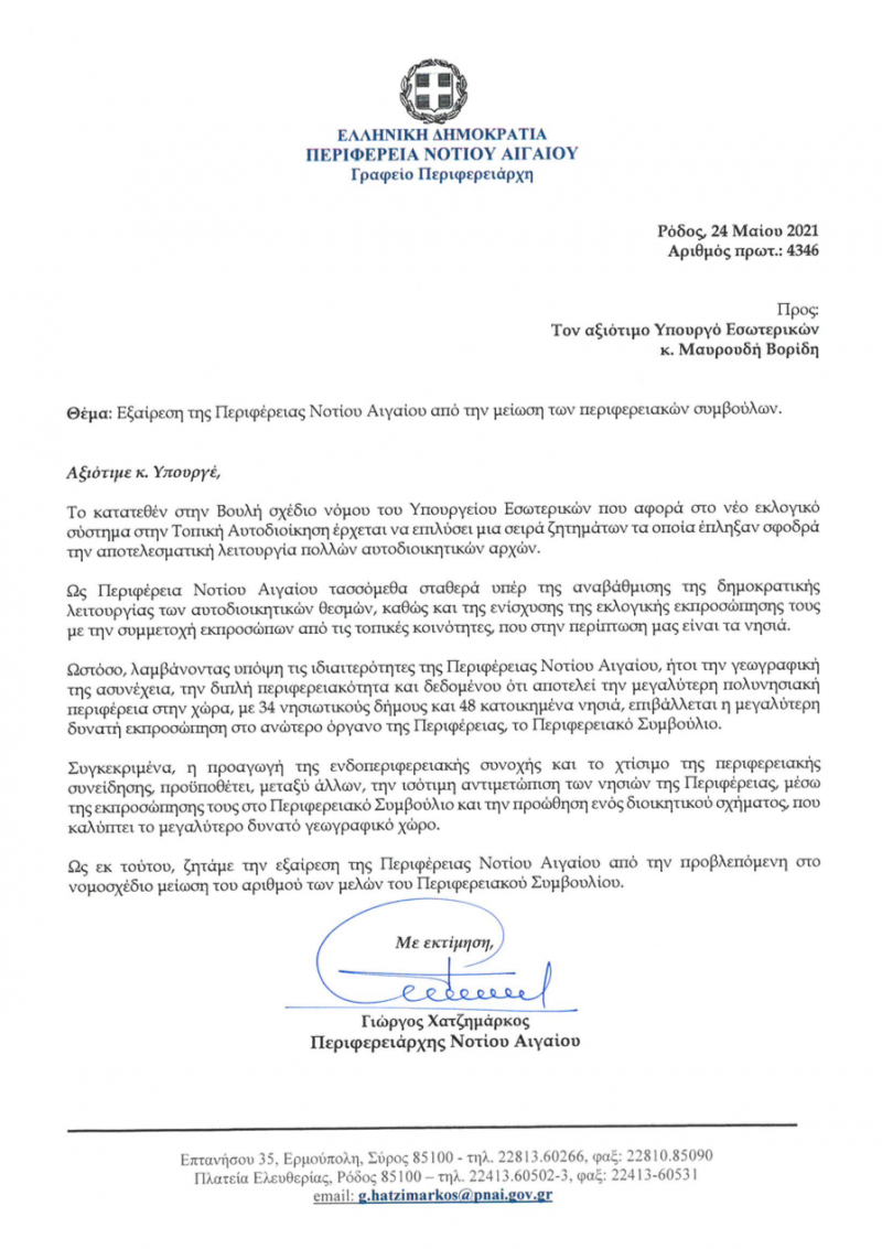 Επιστολή στον Υπουργό Εσωτερικών Μάκη Βορίδη απέστειλε ο Περιφερειάρχης Νοτίου Αιγαίου, Γιώργος Χατζημάρκος, με την οποία ζητά την εξαίρεση της Περιφέρειας Νοτίου Αιγαίου, από την προβλεπόμενη στο κατατεθέν στη Βουλή νομοσχέδιο για το νέο εκλογικό σύστημα, μείωση του αριθμού των μελών του Περιφερειακού Συμβουλίου.