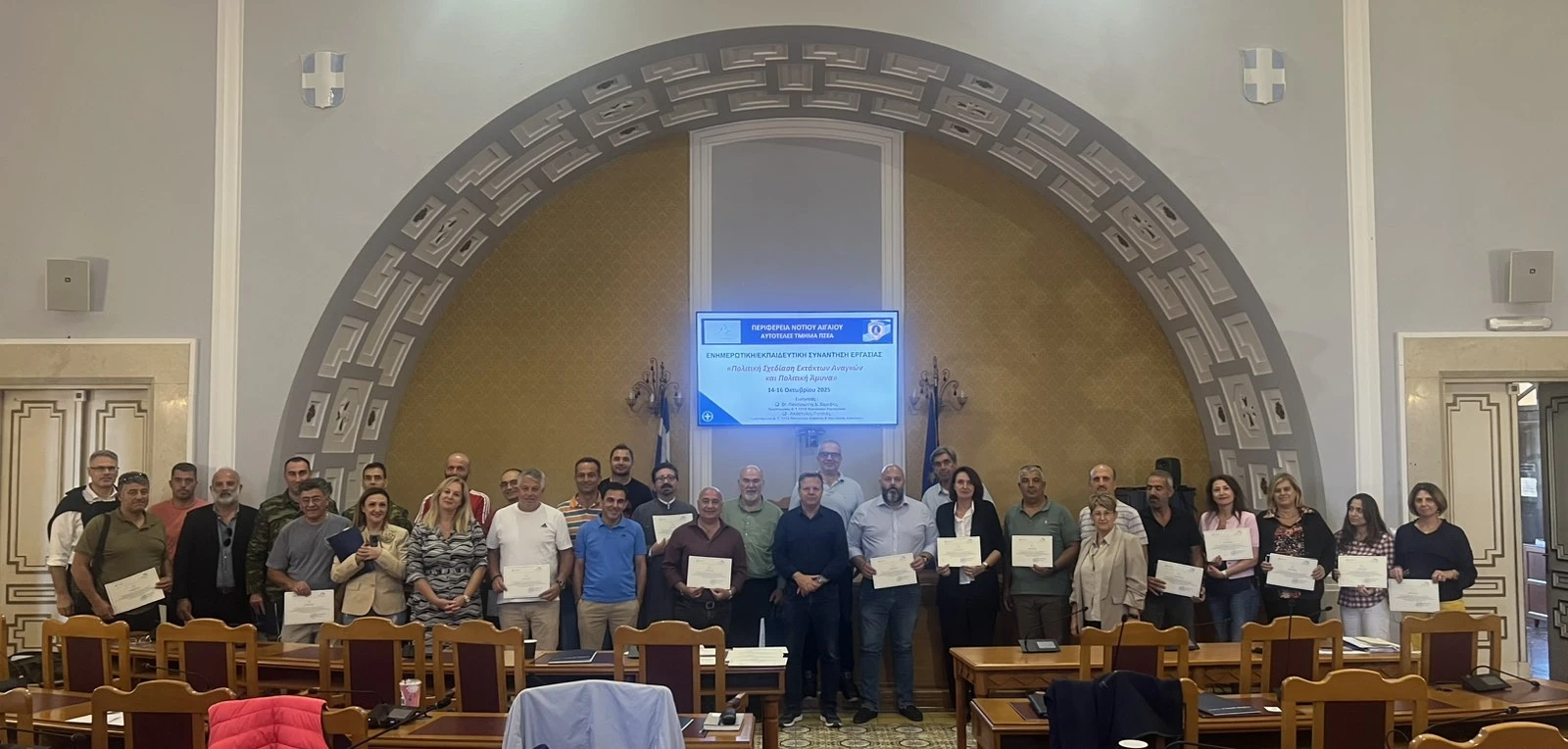 Ολοκληρώθηκε με επιτυχία η ενημερωτική εκπαιδευτική συνάντηση εργασίας με θέμα «Πολιτική Σχεδίαση Εκτάκτων Αναγκών και Πολιτική Άμυνα», που διοργάνωσαν η Περιφέρεια Νοτίου Αιγαίου και το Υπουργείο Εσωτερικών, από τις 14 έως και τις 16 Οκτωβρίου.