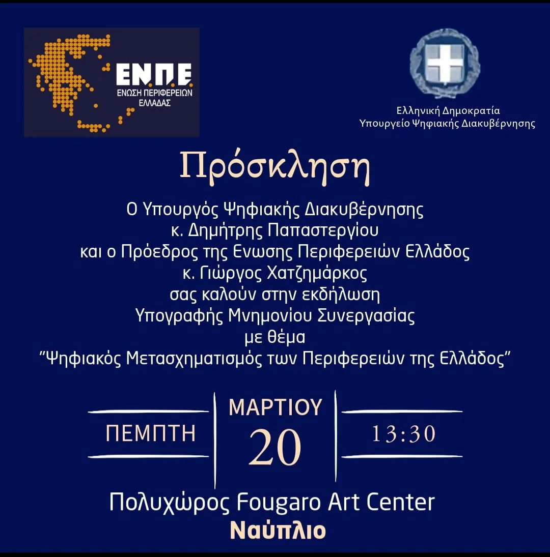 Η εκδήλωση για την υπογραφή του Μνημονίου θα λάβει χώρα στο Ναύπλιο, στον Πολυχώρο “Fougaro Art Center” και ώρα 13:30.