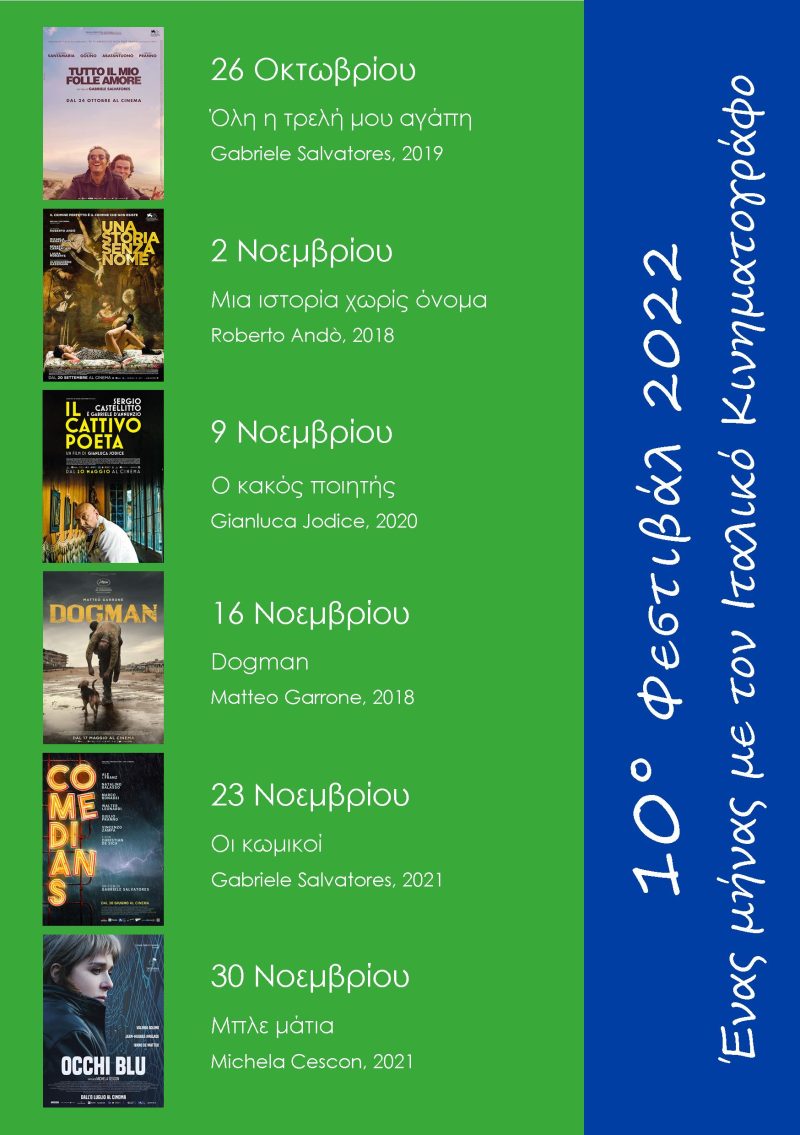Το φετινό αφιέρωμα επιστρέφει διά ζώσης μετά δύο χρόνια διαδικτυακής έκδοσης λόγω πανδημίας με έξι ταινίες που αποτελούν μια επιλογή της πιο πρόσφατης παραγωγής Ιταλών σκηνοθετών. Οι ταινίες είναι σε πρωτότυπη γλώσσα με ελληνικούς υποτίτλους.