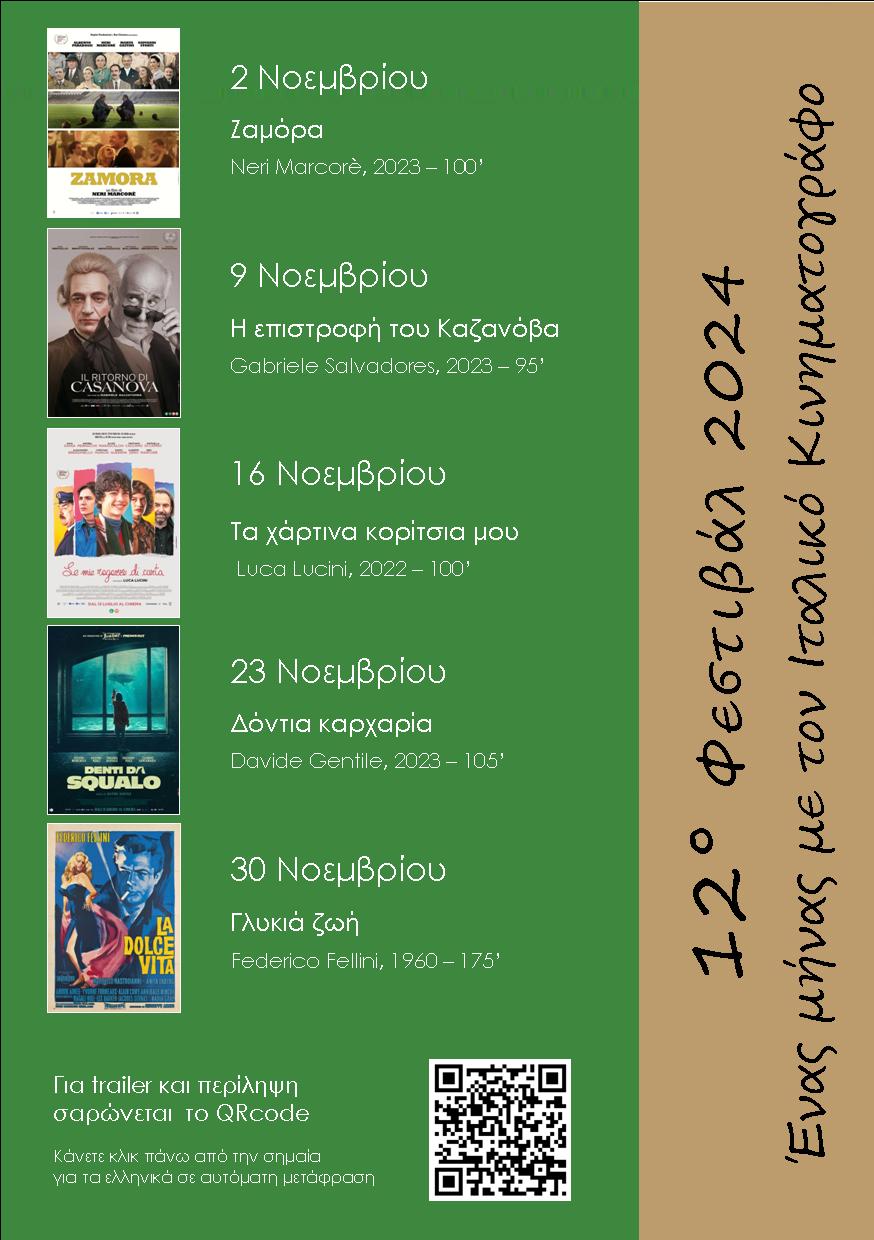 Η εκδήλωση γίνεται με την υποστήριξη του Δήμου και παρουσιάζει πέντε ταινίες που ανήκουν στο 10° αφιέρωμα στο ιταλικό σινεμά, που ταξιδεύει σε 22 μέρη της Ελλάδας μέσω του Δικτύου Ελληνο-Ιταλικής Πολιτιστικής Συνεργασίας καθώς και με την υποστήριξη της ΟΚΛΕ.