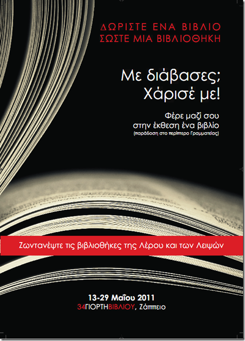 Σε μια εποχή όπου το δημόσιο χρήμα σπαταλάται σε οτιδήποτε άλλο εκτός από την παιδεία, ο Σύλλογος Εκδοτών Βιβλίου Αθηνών (ΣΕΒΑ) συγκέντρωσε 2.771 βιβλία κατά τη διάρκεια της φετινής 34ης Γιορτής Βιβλίου, στο Ζάππειο, τα οποία έφτασαν ήδη στις δανειστικές βιβλιοθήκες Λέρου και Λειψών!
