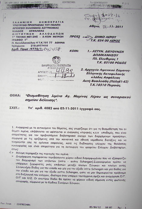 Το Νοέμβριο του 2011 ο Δήμος Λέρου έλαβε το υπ’ αριθμ. 9770/1-842437/24-11-2011 έγγραφο του Υπουργείου Προστασίας του Πολίτη, στο οποίο ξεκαθαρίζονται με τον πιο κατηγορηματικό τρόπο οι υποδομές που πρέπει να υπάρχουν προκειμένου ο λιμένας Αγίας Μαρίνας να λειτουργήσει ως πύλη εισόδου – εξόδου. Εκεί λοιπόν αναγράφεται ότι θα πρέπει να υπάρχουν: