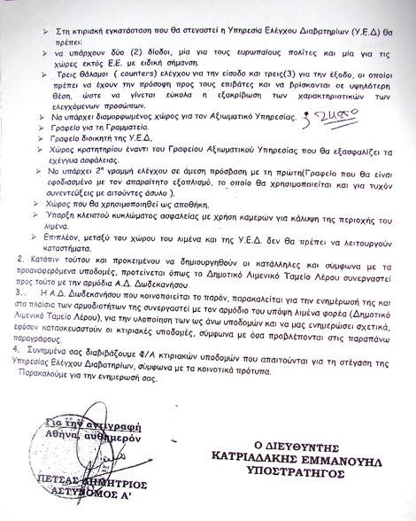 Στη συνέχεια, τονίζει την ανάγκη στέγασης της Υπηρεσίας Ελέγχου Διαβατηρίων σε κτίριο με πολλούς επιμέρους χώρους (για γραφεία, κρατητήριο κ.ο.κ.) και καταλήγει τονίζοντας ότι «μεταξύ του χώρου του λιμένα και της Υπηρεσίας Ελέγχου Διαβατηρίων δεν θα πρέπει να λειτουργούν καταστήματα». Αυτά επαναλαμβάνουμε ότι είναι απαιτήσεις του καθ’ ύλην αρμόδιου Υπουργείου και όχι του ΔΗ.ΛΙ.ΤΑ.Π. ή του ιδιόρρυθμου προέδρου του που δεν θέλει να βοηθήσει τη Λέρο. Άραγε υπάρχουν σήμερα αυτές οι υποδομές στον προβλήτα της Αγίας Μαρίνας; Αυτό το γνωρίζουν καλύτερα από τον καθένα οι πολίτες της Λέρου.