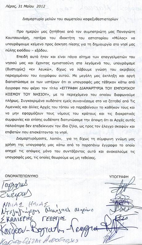Συνέχεια στο σήριαλ με την έγγραφη διαμαρτυρία μερίδας επαγγελματιών της Λέρου, δίνει νέο έγγραφο διαμαρτυρίας κάποιων επαγγελματιών, οι οποίοι αυτή τη φορά στρέφονται κατά συναδέλφου τους.