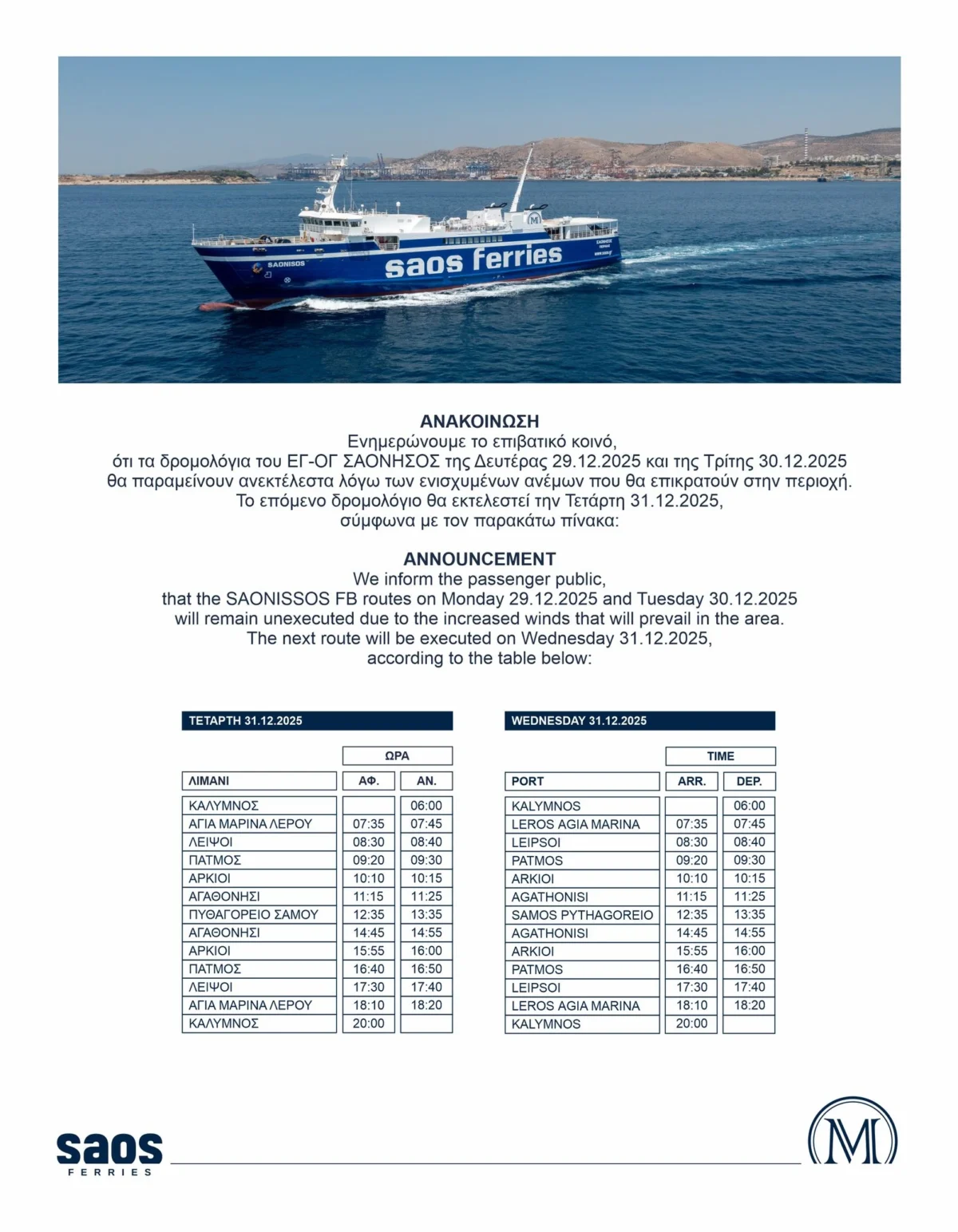 Η SAOS Ferries ενημερώνει το επιβατικό κοινό ότι τα προγραμματισμένα δρομολόγια του Ε/Γ-Ο/Γ πλοίου «ΣΑΟΝΗΣΟΣ» τη Δευτέρα 29 Δεκεμβρίου 2025 και την Τρίτη 30 Δεκεμβρίου 2025 θα παραμείνουν ανεκτέλεστα, λόγω των ενισχυμένων ανέμων που αναμένεται να επικρατήσουν στην περιοχή.
